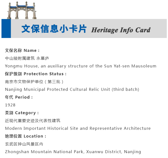 In 1993, the Administration of the Sun Yat-sen Mausoleum restored Yongmu House and Yizheng Pavilion on their original sites, faithfully following their original design. In 2006, Yongmu House was listed as part of the third batch of Nanjing Municipal Protected Cultural Relic Units.