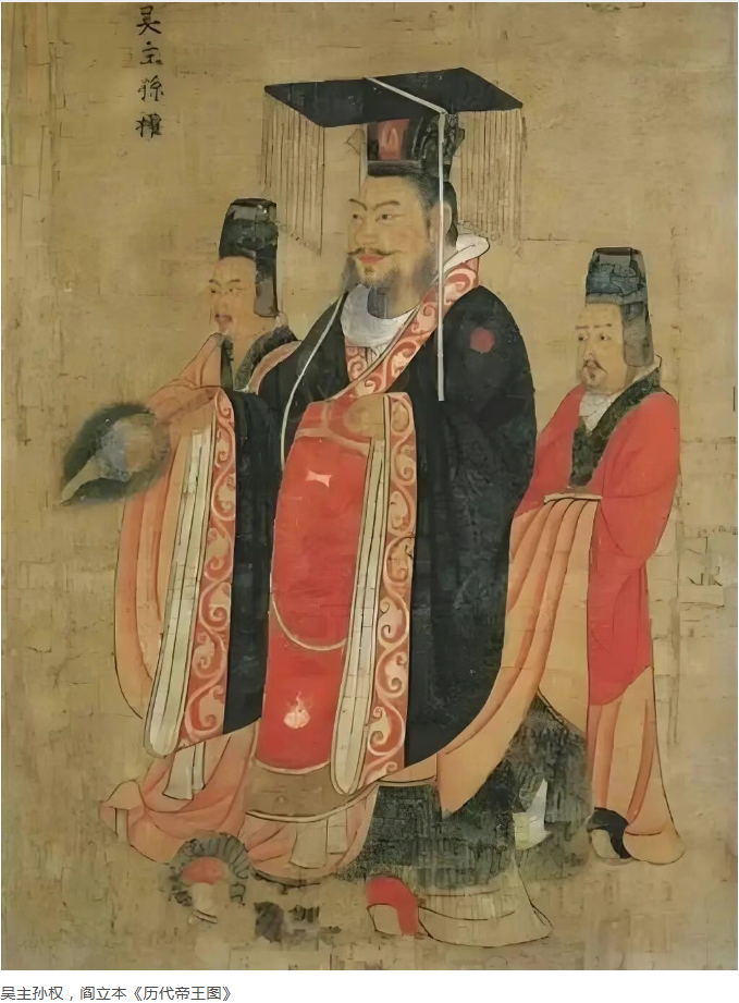 Sun Quan, courtesy name Zhongmou, was born in present-day Fuyang, Zhejiang. As the founding emperor of Eastern Wu, he ruled for 24 years and was later honored with the title Emperor Da of Wu and the temple name Taizu. He was buried at Jiangling.